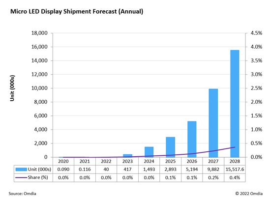 According to market forecasts, the Micro-LED market has huge potential and is expected to achieve rapid growth in the near future. Omdia expects annual global shipments of Micro-LED displays to soar to nearly 15.5 million units by 2028.