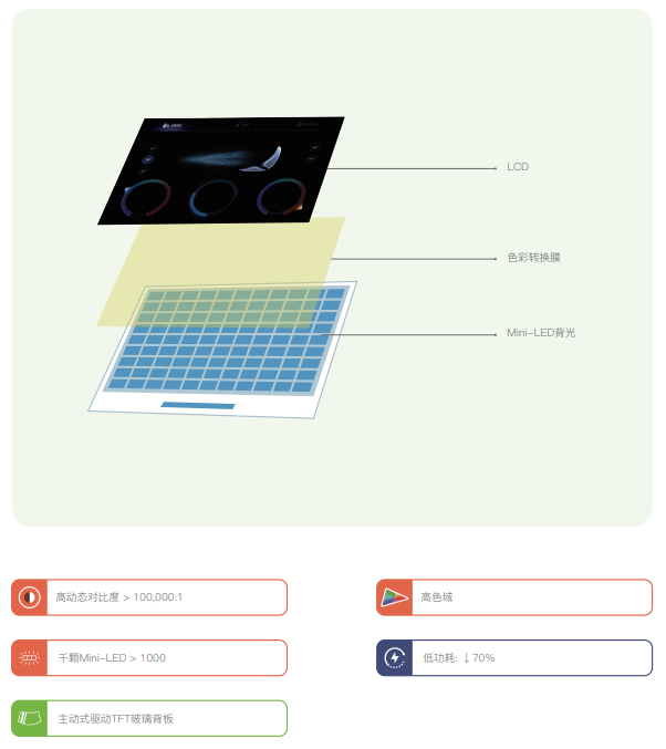 Mini-LED显示模组由具有数千颗Mini-LED的TFT玻璃背板以及色彩转换膜和TFT-LCD组成。可实现高动态对比度, 卓越的显示图像质量和节能效果。