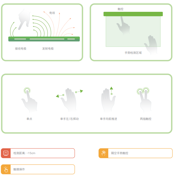 手势触控技术允许在非接触的情况通过识别不同的手势进行操作。当手靠近时,传感器基片上发射电极和接收电极之 间产生电场,检测静电电容的变化,并相应地做出判断和响应。
